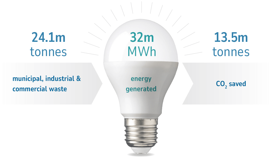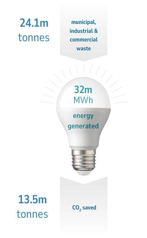 Put in concrete figures: 24.1 million tonnes of municipal, industrial and commercial waste were transformed into 32 million megawatt hours of electricity in Germany in 2019.1 Which means CO2 savings of 13.5 million tonnes compared to the same amount of energy produced from fossil fuels. The same amount of CO2 emitted by the whole of Lithuania.2